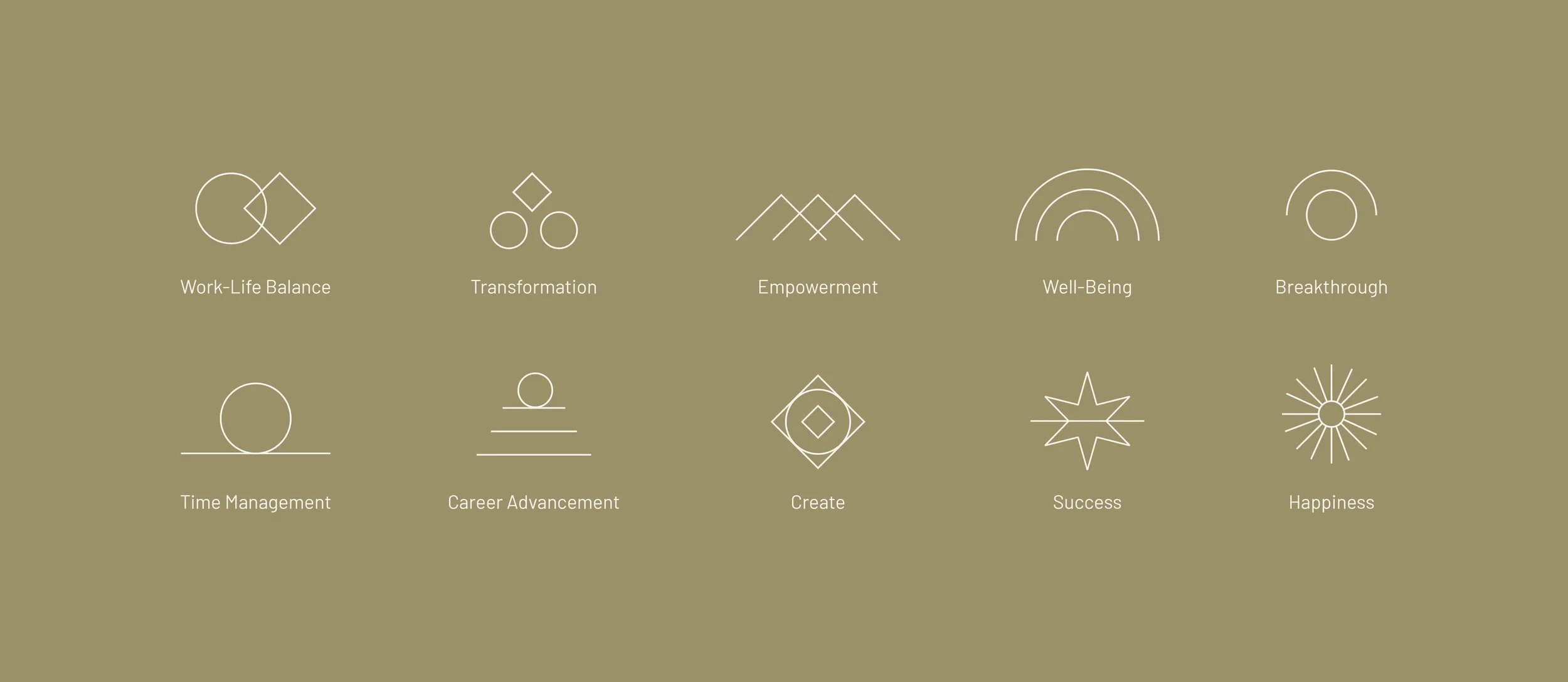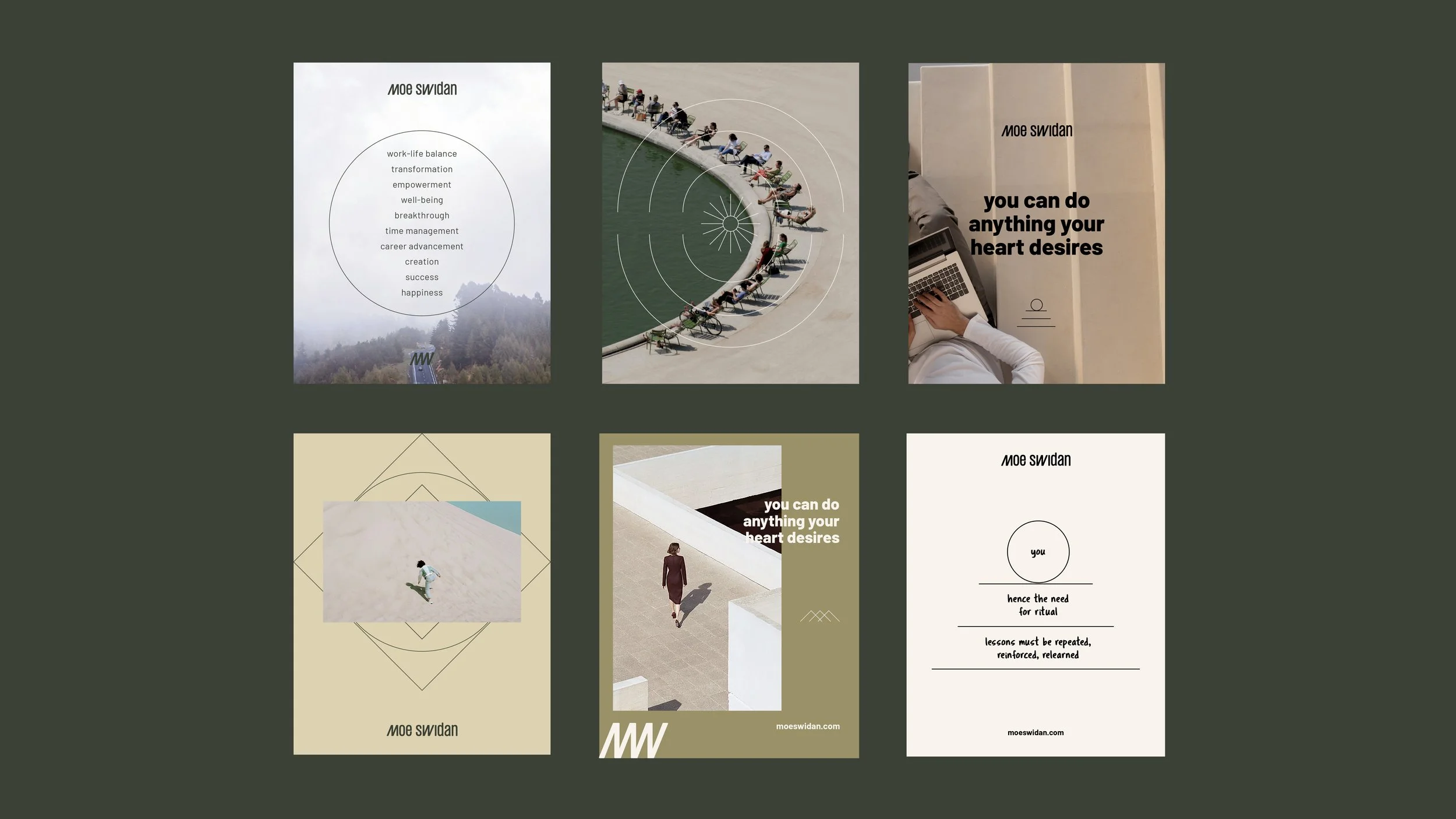 The wider identity system is constructed using basic geometric elements, reinforcing the idea that clarity comes from simplifying. Nothing excessive, nothing distracting, just what matters. A palette of khaki and earthy greens introduces warmth and balance, allowing the messaging to lead while the visuals support. Compositions remain restrained and intentional, creating space for reflection rather than noise.